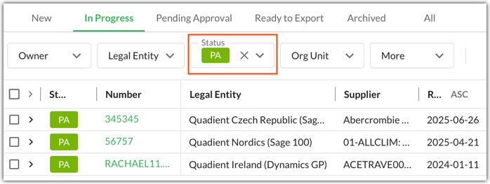 Other users can view pending invoices by filtering by Pending Approval status in the In Progress or All tabs.