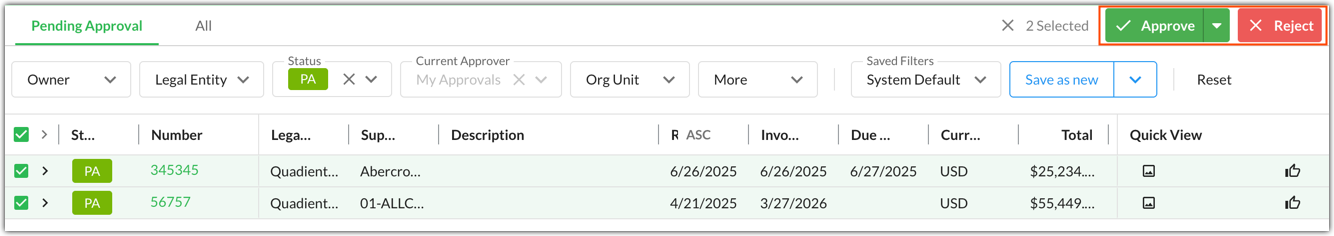 Click Approve or Reject to approve or reject all selected invoices.