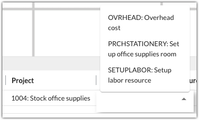 When coding an invoice, selecting a value from a Project and Job Costing list will scope the options available in other lists. For example, only job categories associated with the project 1004: Stock office supplies are visible.