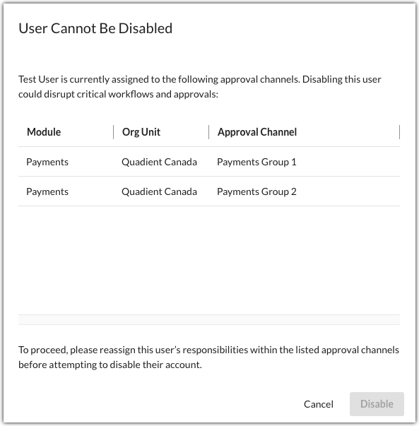 Users cannot be disabled if they are in one or more approval channels. In the following example, user Test User cannot be disabled as they are assigned to approval channels Payments Group 1 and Payments Group 2. The user must be removed from these channels before their profile can be disabled.