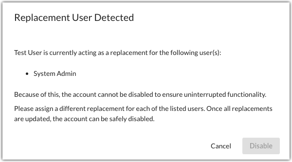 Users cannot be disabled if they are a substitute approver for another user. In the following example, user Test User cannot be disabled as they are substitute approver for user System Admin. Assign a new substitute approver for System Admin to disable Test User's profile.