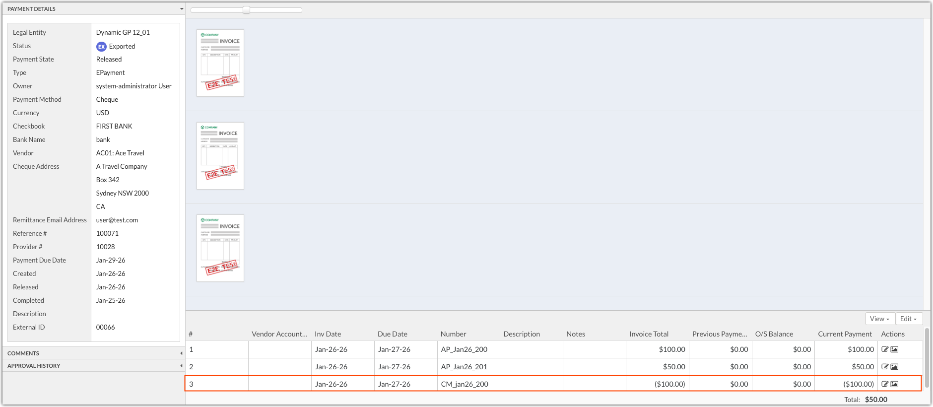QAP now supports credit notes when making payments for Dynamics GP®. Any open credit memos for a vendor can be selected when creating a payment. The credit memo amount will be subtracted from the payment total. In the example below, the credit memo included in payment 100071 reduced the payment amount from $150 to $50.